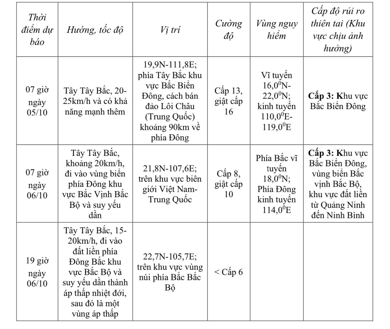 Từ đêm 05/10 đến hết đêm 07/10, ở khu vực Bắc Bộ, Thanh Hóa và Nghệ An có mưa to đến rất to với lượng mưa phổ biến 100-200mm, cục bộ có nơi trên 300mm; riêng khu vực vùng núi và trung du Bắc Bộ phổ biến từ 150-250mm, cục bộ có nơi trên 400mm. Cảnh báo nguy cơ mưa có cường suất lớn (>200mm/3h).