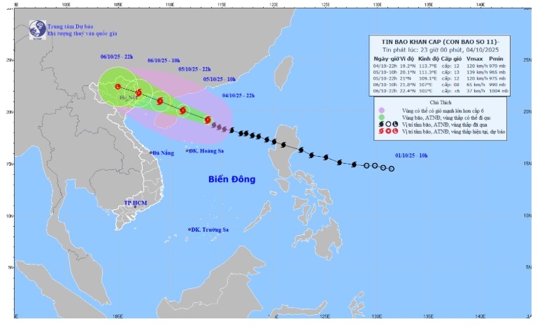 Hồi 22h ngày 4/10, vị trí tâm bão ở vào khoảng 19,2 độ Vĩ Bắc; 113,7 độ Kinh Đông, trên khu vực Bắc Biển Đông, cách đảo Hải Nam (Trung Quốc) khoảng 290km về phía Đông Đông Nam, cách Quảng Ninh khoảng 680km về phía Đông Nam. Sức gió mạnh nhất vùng gần tâm bão mạnh cấp 12 (118-133km/giờ), giật cấp 15. Di chuyển theo hướng Tây Tây Bắc, tốc độ khoảng 25km/h.