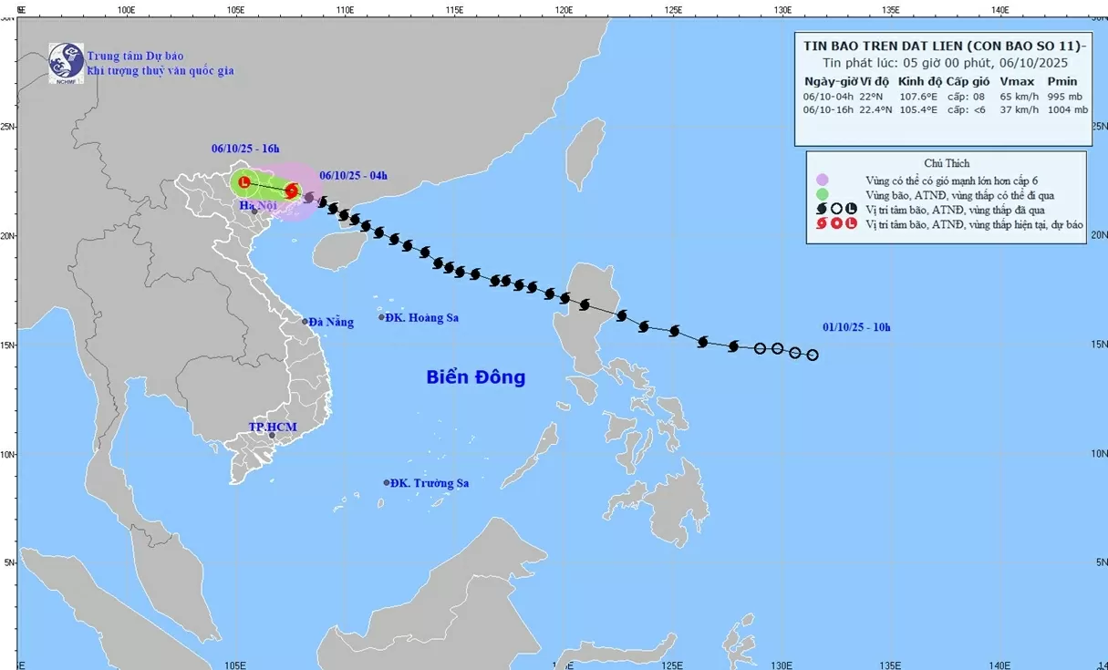 Dự báo, đến chiều nay (6/10), bão số 11 suy yếu thành vùng áp thấp trên khu vực vùng núi Bắc Bộ. (Nguồn: NCHMF)