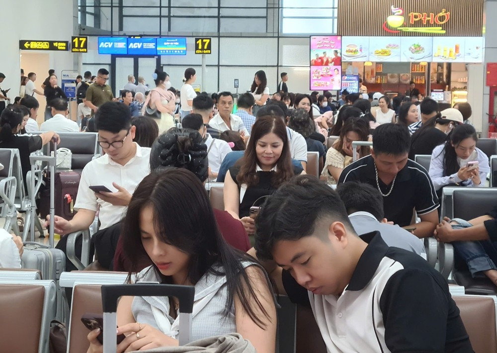 Hành khách vạ vật ở sân bay Nội Bài chờ chuyến bay.