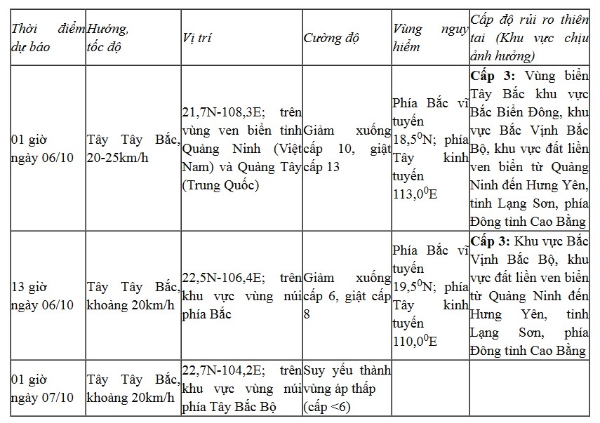 Các xã/phường khu vực phía Đông Bắc của tỉnh Quảng Ninh khả năng có gió mạnh cấp 9-10, giật cấp 12-13; khu vực các xã/phường còn lại của tỉnh Quảng Ninh và khu vực ven biển TP. Hải Phòng khả năng có gió mạnh cấp 8-9, giật cấp 10-11; khu vực các xã/phường ven biển tỉnh Hưng Yên và khu vực các xã vùng biên giới phía Bắc của tỉnh Lạng Sơn có khả năng có gió mạnh cấp 6-8, giật cấp 9-10; khu vực phía Đông Bắc tỉnh Bắc Ninh (tỉnh Bắc Giang cũ) và khu vực phía Đông của tỉnh Cao Bằng khả năng có gió mạnh cấp 6-7, giật cấp 8-9.