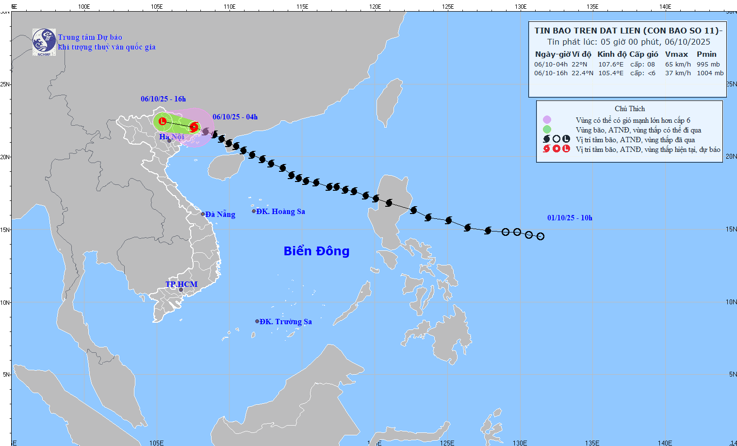 Theo Trung tâm Dự báo khí tượng thủy văn Quốc gia, sáng sớm nay (6/10), bão số 11 đã đi vào đất liền khu vực Phòng Thành (tỉnh Quảng Tây, Trung Quốc). Do ảnh hưởng của bão, tại Bạch Long Vĩ đã có gió mạnh cấp 8, giật cấp 9; Cô Tô có gió mạnh cấp 6, giật cấp 8; vùng ven biển Quảng Ninh – Hải Phòng có gió giật cấp 6–7.