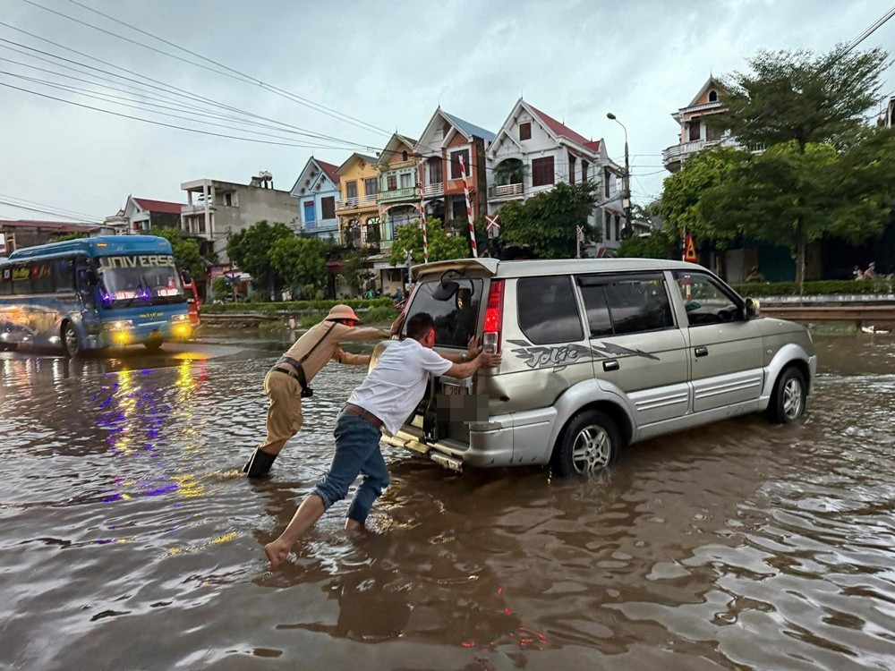 Tại Km104 - Quốc lộ 1A địa phận Bắc Ninh nước ngập sâu, một số phương tiện bị chết máy được lực lượng Cảnh sát giao thông hỗ trợ đẩy xe.