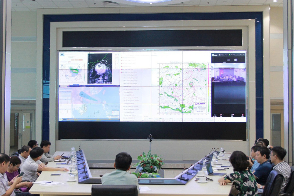 Các chuyên gia họp phân tích, trao đổi về diễn biến bão số 11 tại Cục Khí tượng Thủy văn sáng 4/10. Ảnh: Cục KTTV
