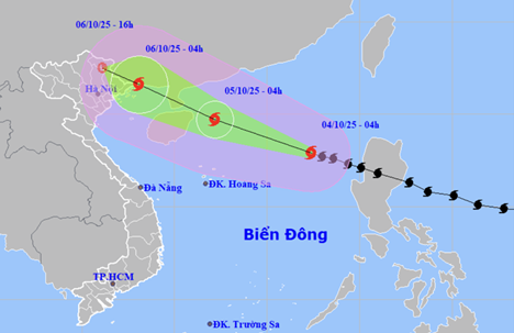 Dự báo trong 24 giờ tới, bão sẽ đi vào Biển Đông và có khả năng mạnh thêm. Đến 4 giờ sáng 5.10, tâm bão sẽ ở trên khu vực Bắc Biển Đông và cường độ đạt cấp 13, giật cấp 16.