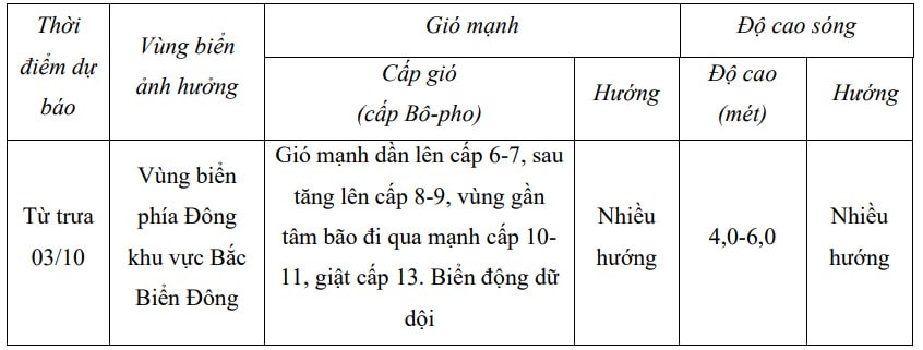 Chuyên gia khí tượng cảnh báo, từ trưa và chiều 3/10, vùng biển phía Đông khu vực Bắc Biển Đông có gió mạnh dần lên cấp 6-7; sau tăng lên cấp 8-9, vùng gần tâm bão đi qua mạnh cấp 10-11, giật cấp 13, sóng biển cao 4,0-6,0m. Biển động dữ dội.
