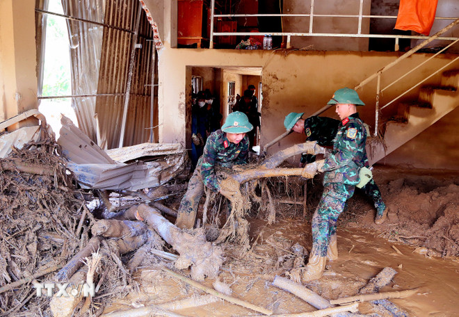 Lực lượng bộ đội được huy động để giúp nhân dân xã Chiềng Sơ nhanh chóng khắc phục hậu quả của lũ ống, lũ quét. (Ảnh: Quang Quyết/TTXVN)