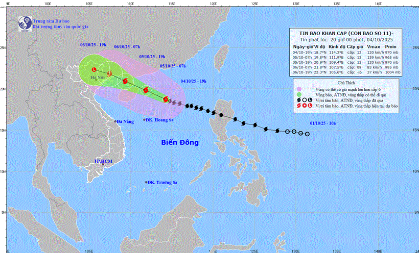 Hồi 19 giờ ngày 4/10, vị trí tâm bão ở vào khoảng 18,7 độ Vĩ Bắc; 114,3 độ Kinh Đông, trên khu vực Bắc Biển Đông, cách đảo Hải Nam (Trung Quốc) khoảng 380km về phía Đông Đông Nam. Sức gió mạnh nhất vùng gần tâm bão mạnh cấp 12 (118-133km/giờ), giật cấp 15. Di chuyển theo hướng Tây Tây Bắc, tốc độ khoảng 25km/h.