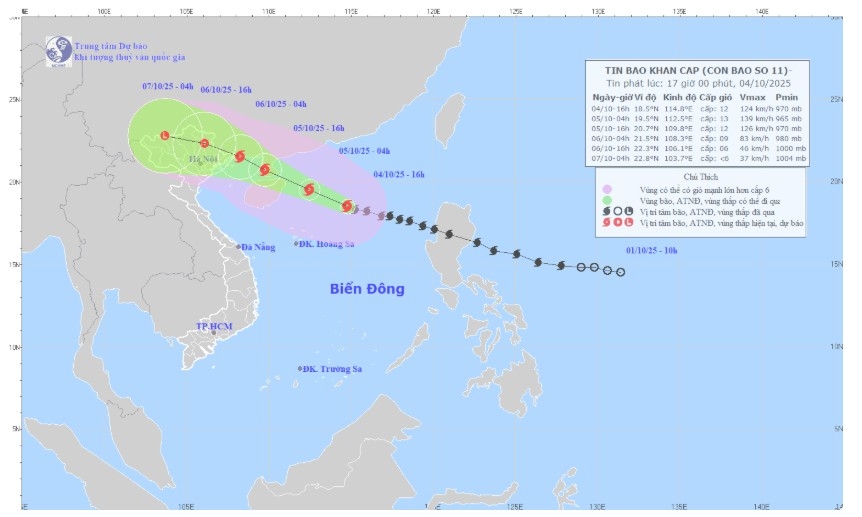 Đến 16h ngày 5/10, bão di chuyển theo hướng Tây Tây Bắc với tốc độ 20-25km/h và có khả năng mạnh thêm. Vị trí tâm bão ở khoảng 20,7 độ Vĩ Bắc; 109,8 độ Kinh Đông, trên khu vực phía Tây bán đảo Lôi Châu (Trung Quốc), cách Quảng Ninh khoảng 250km về phía Đông Nam. Cường độ bão mạnh cấp 12, giật cấp 15. Vùng nguy hiểm nằm phía Bắc vĩ tuyến 16,5 độ Bắc và từ kinh tuyến 109,0 đến 118,0 độ Đông. Cấp độ rủi ro thiên tai cấp 3, khu vực chịu ảnh hưởng là Bắc Biển Đông.