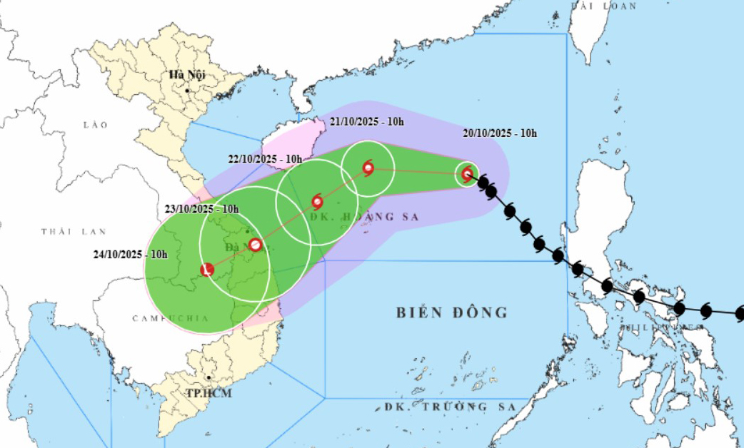 Đến 10 giờ ngày 22/10, bão chuyển hướng tây nam, tốc độ khoảng 10km/giờ, nằm tại vị trí 17,1 độ vĩ bắc; 110,7 độ kinh đông. Cường độ bão sẽ suy yếu một chút, xuống còn cấp 10, giật cấp 12.