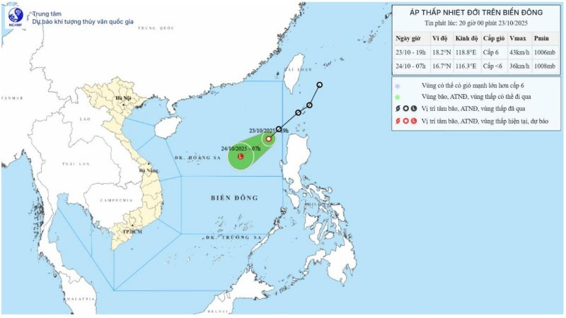 Đến 7 giờ sáng mai (24/10), vị trí tâm áp thấp nhiệt đới ở vào khoảng 16,7 độ vĩ bắc; 116,3 độ kinh đông. Áp thấp nhiệt đới di chuyển theo hướng tây nam với tốc độ khoảng 25km/giờ trên khu vực bắc Biển Đông, sau đó suy yếu dần thành một vùng áp thấp. Rủi ro thiên tai: Cấp 3 tại vùng biển phía đông khu vực bắc Biển Đông.
