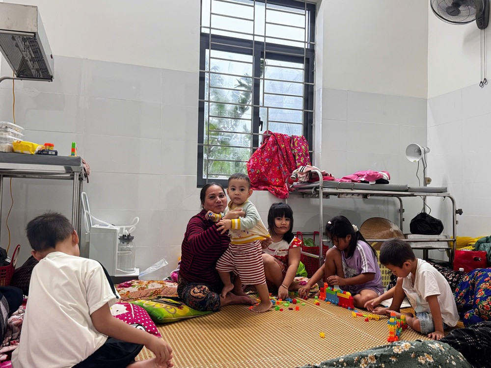 Tại Trường Mầm non Phổ Thạnh, một trong những nơi tập trung đông dân nhất, nhiều gia đình đã ổn định chỗ ngủ. Trong số đó có cụ Lê Thị Châu (92 tuổi, trú thôn Thạch Bi 2), vừa được con trai chở bằng xe máy đến nơi sơ tán.