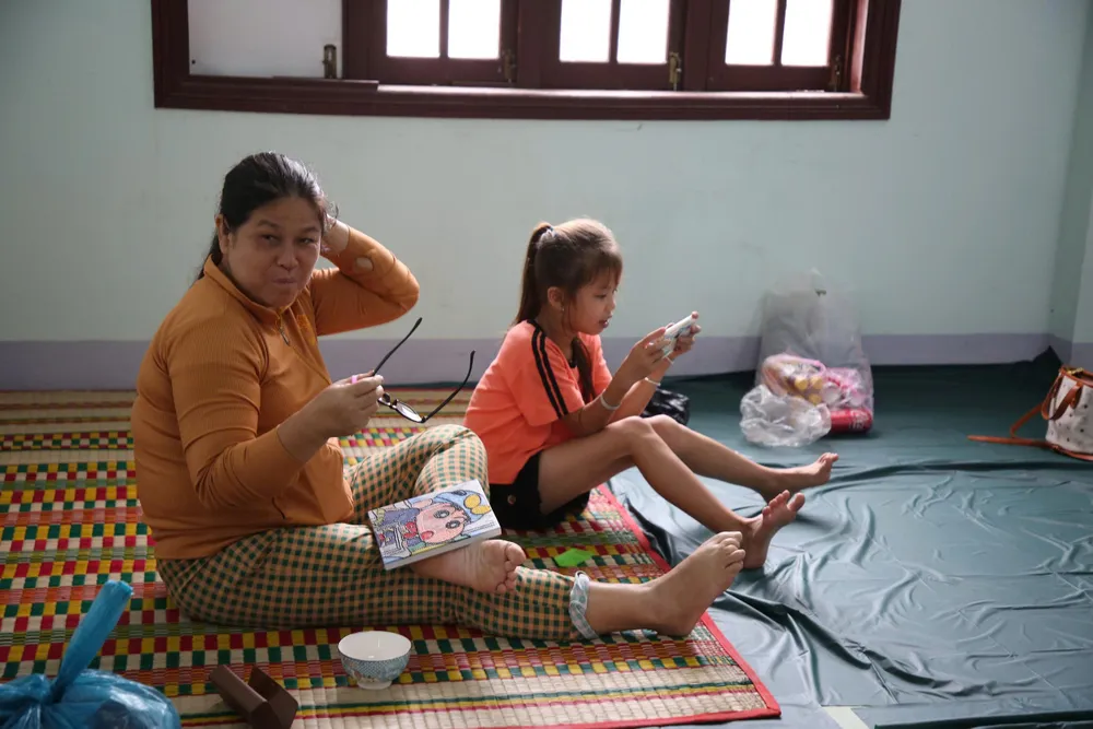 Bà Cận (áo xanh) cùng hàng xóm đến Trường Tiểu học Phổ An tránh bão.