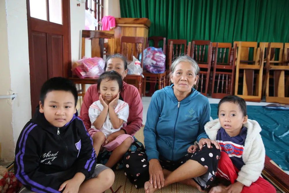 Bà Thanh (áo xanh) cùng cháu ngoại được đưa đến trụ sở Ban chỉ huy quân sự xã An Phú để trú tránh bão. Ảnh: NY