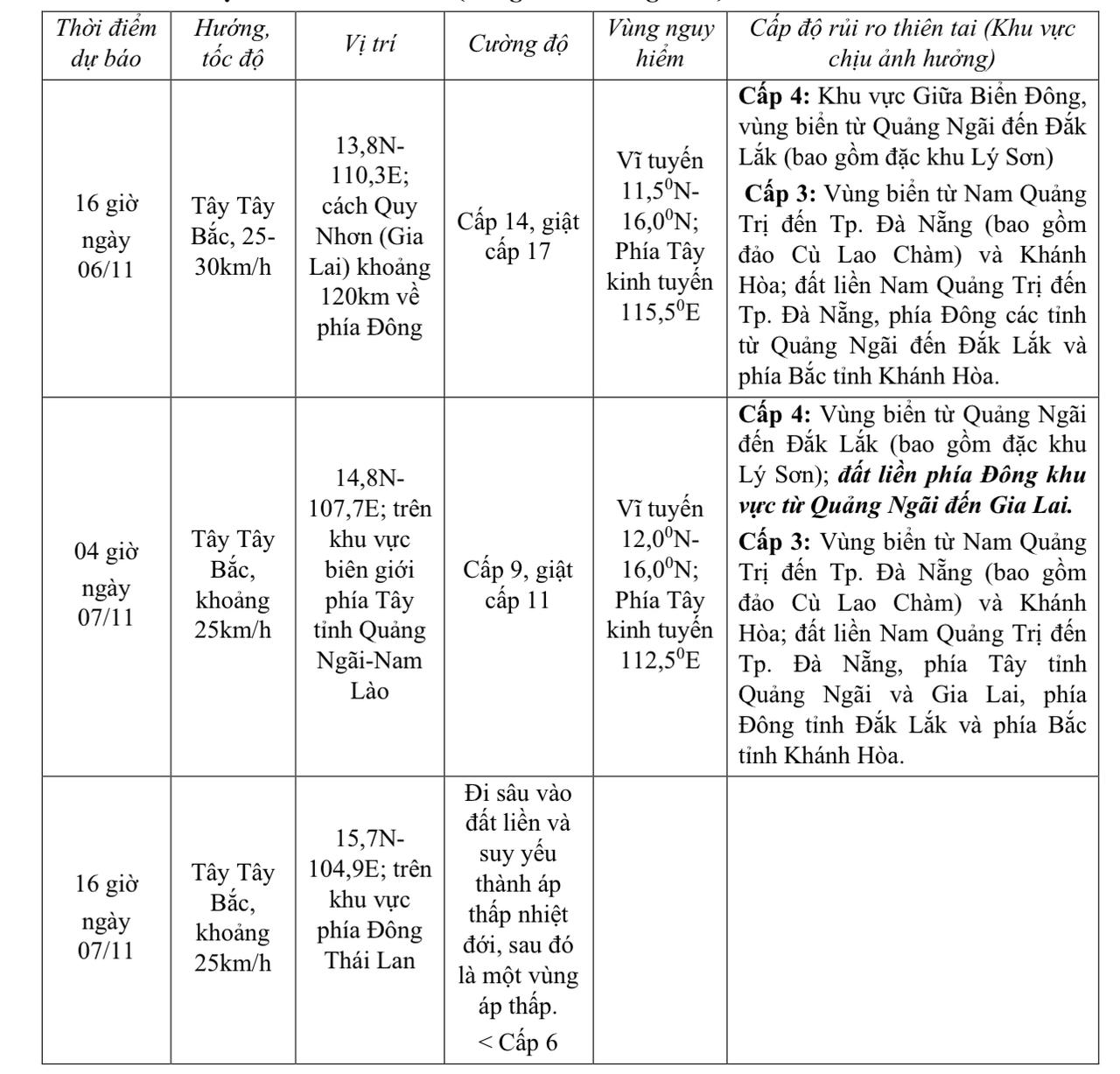 Từ sáng ngày 06/11, vùng biển từ Nam Quảng Trị đến Khánh Hòa (bao gồm đặc khu Lý Sơn, đảo Cù Lao Chàm) gió mạnh dần lên cấp 6-7, sau tăng lên cấp 8-11, sóng biển cao 3,0-6,0m; vùng gần tâm bão đi qua mạnh cấp 12-14, giật cấp 17, sóng biển cao 7,0-9,0m; biển động dữ dội.