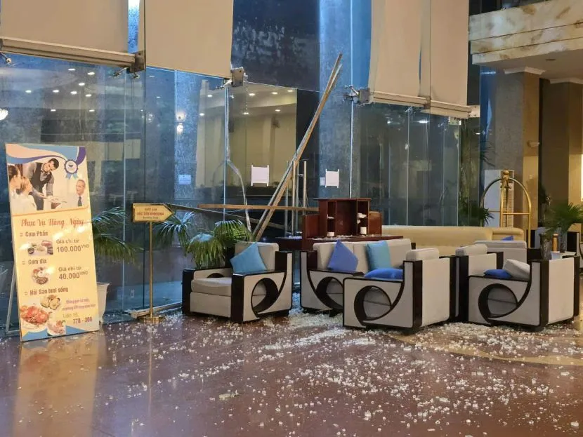 Kính cường lực tại khách sạn bị bể. Ảnh: LÊ KIẾN