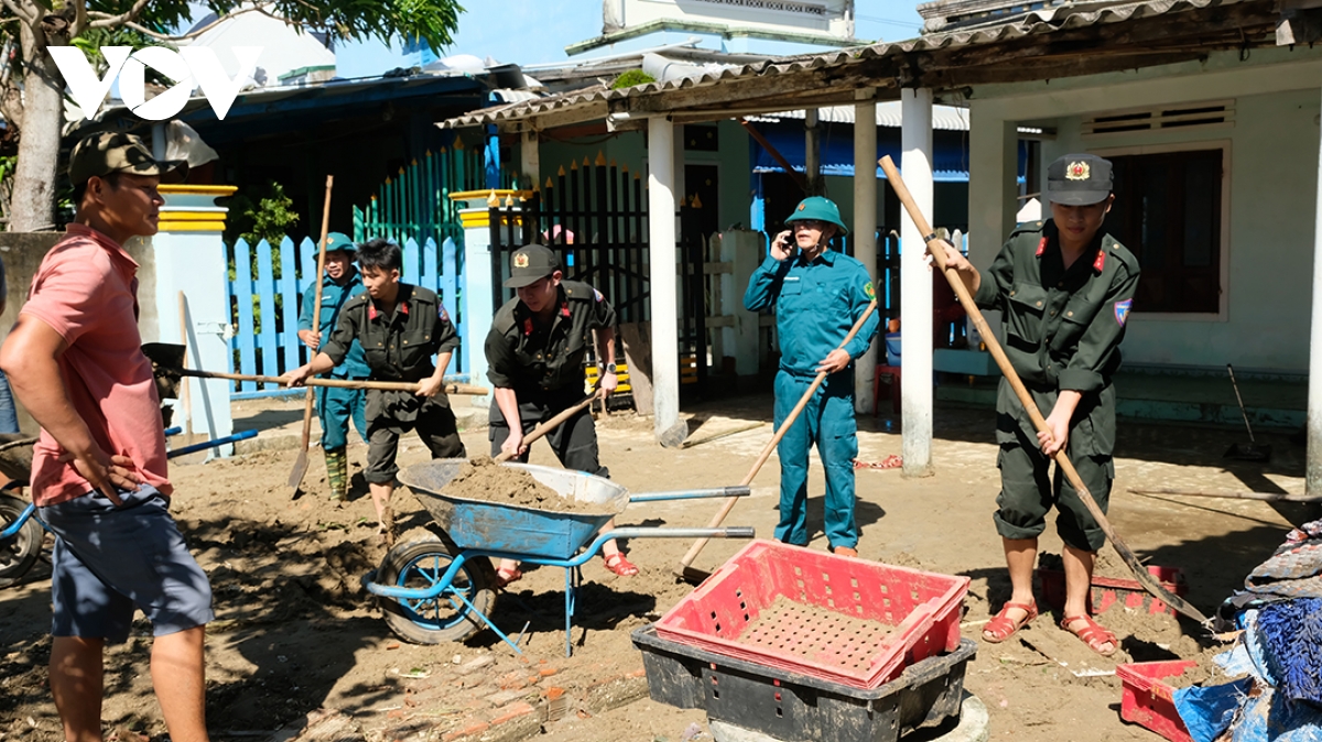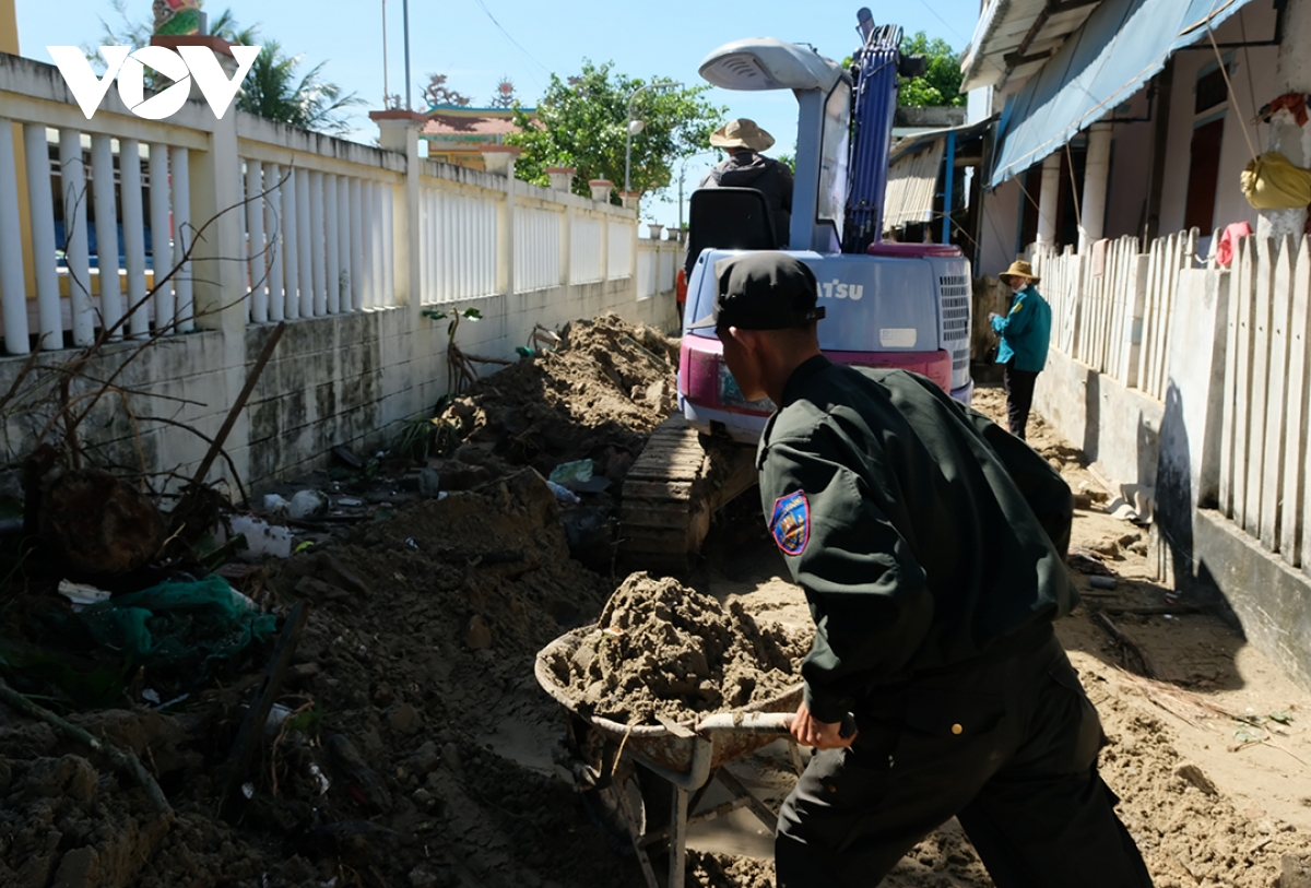 Các lực lượng giúp dân khắc phục hậu quả bão số 13.