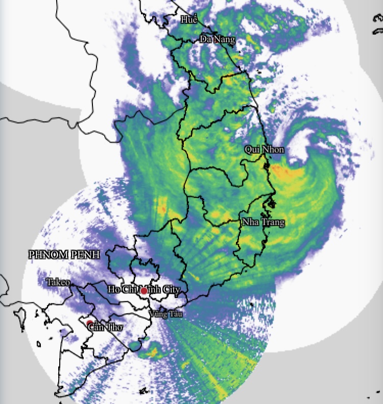 Ảnh radar thời tiết lúc 16 giờ 30 phút ngày 6-11 cho thấy mưa rất lớn ở Nam Trung bộ