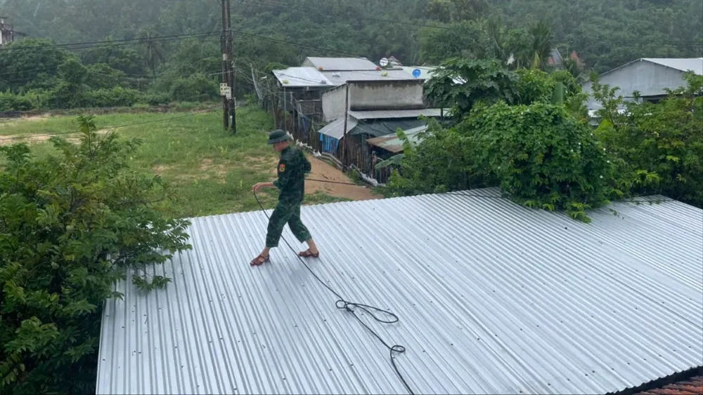 Chiến sĩ Đồn Biên phòng Xuân Đài giúp người dân gia cố mái nhà. Ảnh: X.H