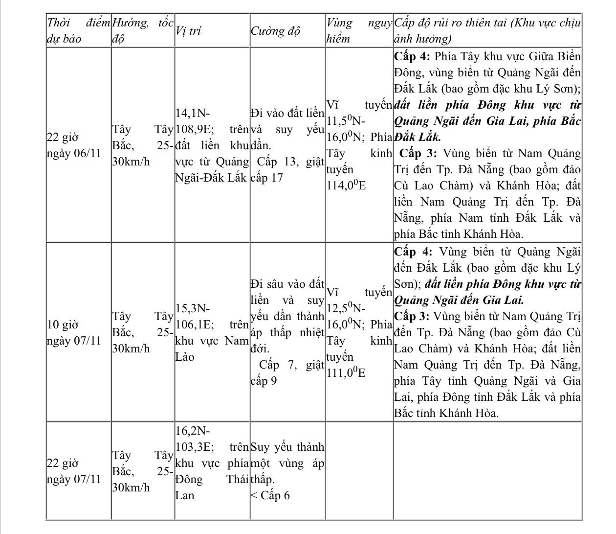 Từ ngày 06-07/11, khu vực từ Tp. Đà Nẵng đến Đắk Lắk có mưa rất to với lượng mưa phổ biến 200-400mm/đợt, cục bộ có nơi trên 600mm/đợt; khu vực từ Nam Quảng Trị đến Tp. Huế, Khánh Hòa và Lâm Đồng có mưa to với lượng mưa phổ biến 150-300mm/đợt, cục bộ có nơi mưa rất to trên 450mm/đợt. Từ ngày 08/11 mưa lớn ở các khu vực nói trên có xu thế giảm.