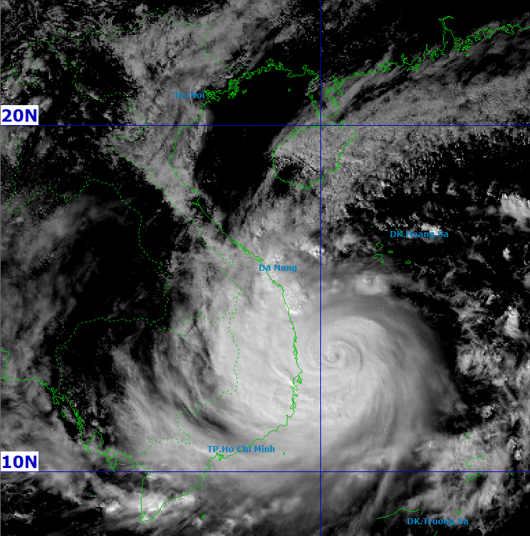 Ảnh mây vệ tinh bão số 13 lúc 14h, mắt bão rõ và vành mây dày đặc sẽ gây ra gió rất mạnh và mưa lớn dữ dội. Nguồn: NCHMF