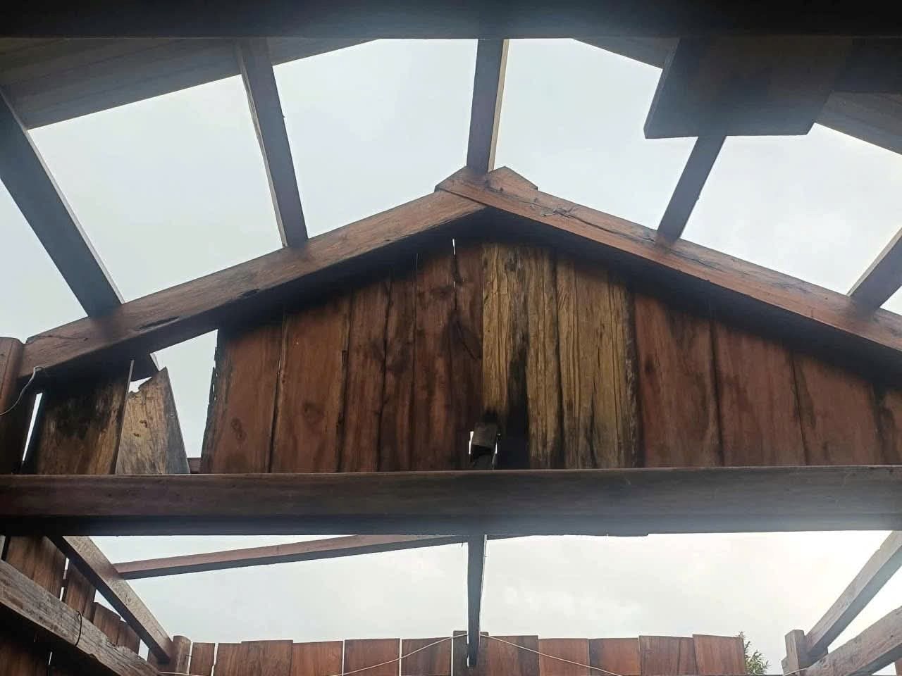 Mái nhà của người dân xã Trà Linh bị gió bão cuốn bay, chỉ còn trơ khung gỗ.