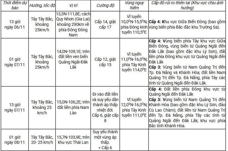Từ gần sáng 6/11, vùng biển từ Nam Quảng Trị đến Khánh Hòa (bao gồm khu vực Lý Sơn, Cù Lao Chàm) gió mạnh dần lên cấp 6-7, sau tăng lên cấp 8-11, vùng gần tâm bão cấp 12-14, giật cấp 17; sóng biển cao 3-5 m, vùng gần tâm bão 6-8 m, biển động dữ dội.