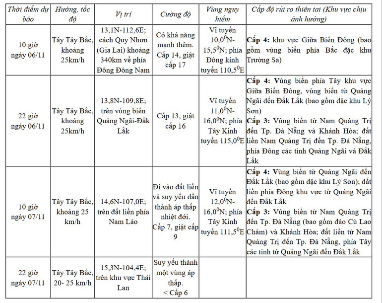 Cảnh báo từ chiều tối ngày 6/11, khu vực ven biển từ thành phố Huế đến Đắk Lắk đề phòng mực nước biển dâng cao kèm theo sóng lớn gây ngập úng tại khu vực trũng thấp, sóng tràn đê, đường giao thông ven biển, sạt lở bờ biển, làm chậm thoát lũ trên khu vực. Toàn bộ tàu, thuyền, khu nuôi trồng thủy sản trong các vùng nguy hiểm nói trên đều chịu tác động mạnh của dông, lốc, gió mạnh, sóng lớn và nước biển dâng.