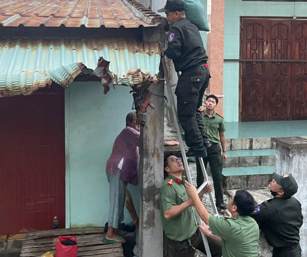 Lực lượng Cảnh sát cơ động hỗ trợ chằng chống nhà cửa cho người dân phường Sa Huỳnh, tỉnh Quảng Ngãi.
