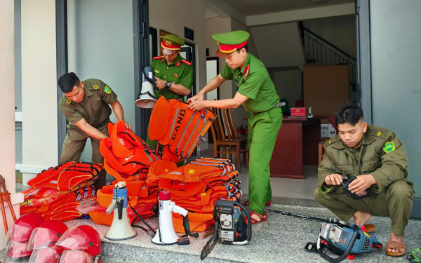 Cán bộ Công an xã Avương kiểm đếm trang thiết bị, sẵn sàng ứng phó với bão số 13 và mưa lũ sau bão.