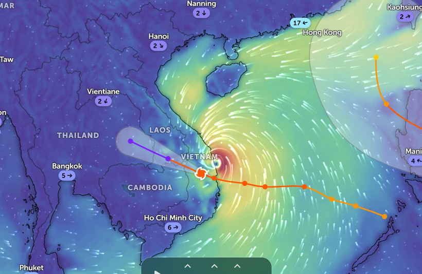 Hướng di chuyển của bão số 13 (Kalmaegi) lúc 22 giờ ngày 6/11/2025. (Nguồn: Zoom Earth)