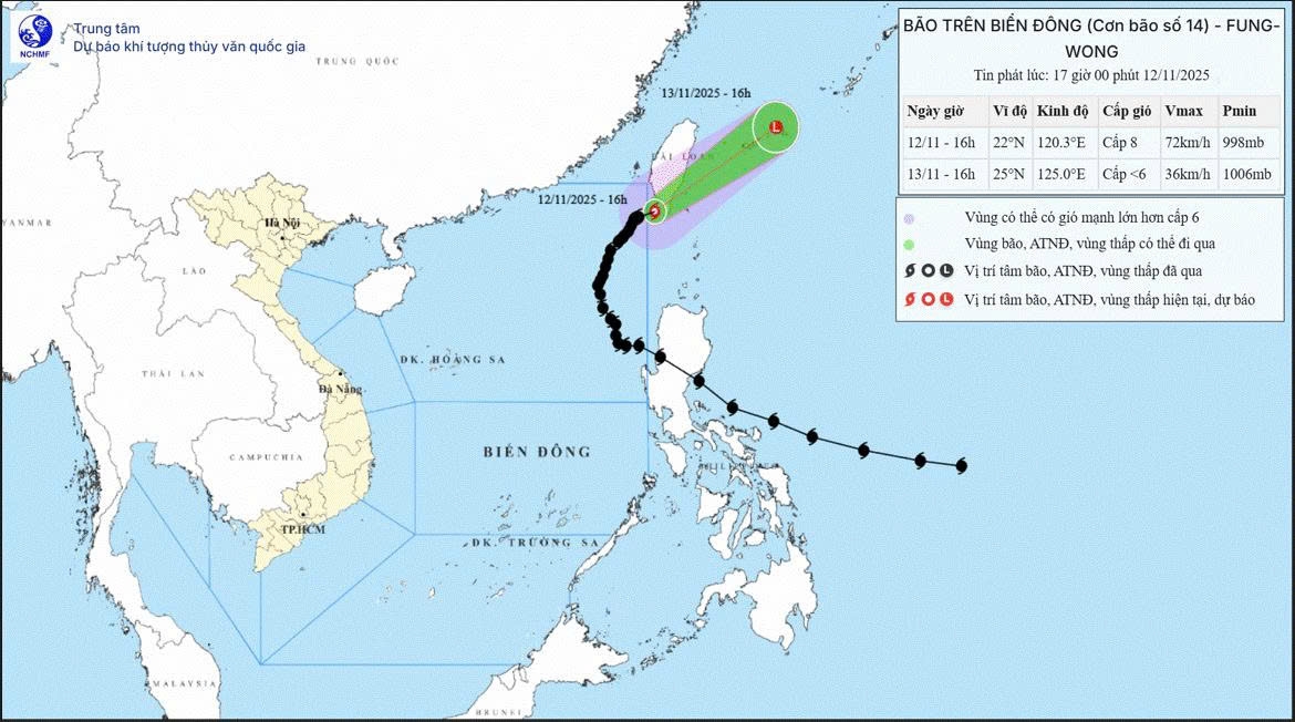 Dự báo trong 24 giờ tới, bão tiếp tục di chuyển theo hướng Đông Bắc, tốc độ 20-25 km/h và suy yếu dần thành áp thấp nhiệt đới, sau đó là một vùng áp thấp. Như vậy, bão số 14 không còn khả năng quay trở lại Biển Đông.