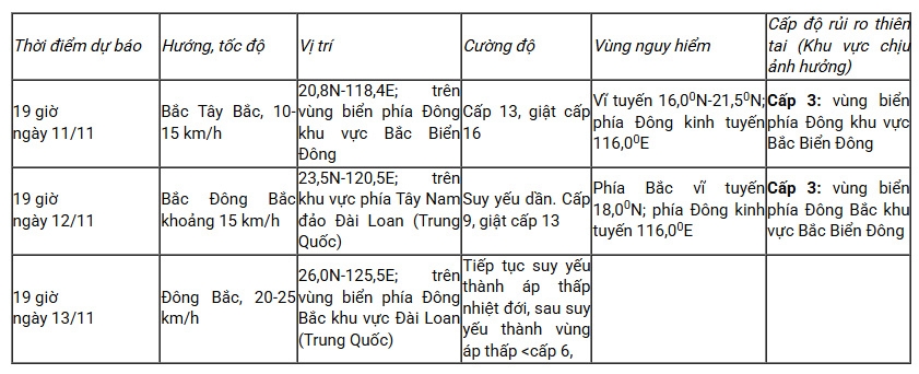 Theo Trung tâm Dự báo Khí tượng Thủy văn Quốc gia, hồi 19 giờ ngày 10/11, vị trí tâm bão ở vào khoảng 18,1 độ Vĩ Bắc; 118,6 độ Kinh Đông, trên vùng biển phía Đông khu vực Bắc Biển Đông. Sức gió mạnh nhất vùng gần tâm bão mạnh cấp 13 (134-149km/giờ), giật cấp 16. Di chuyển theo hướng Bắc Tây Bắc, tốc độ khoảng 10km/h.