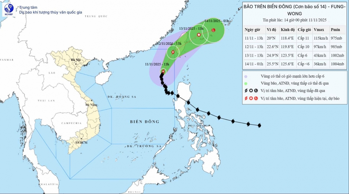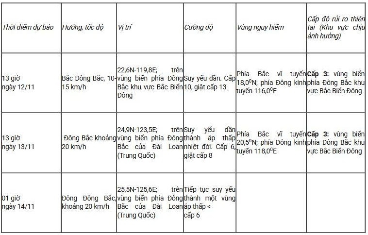 Theo Trung tâm Dự báo Khí tượng Thủy văn Quốc gia, hồi 13h ngày 11/11, vị trí tâm bão ở khoảng 20,0 độ vĩ Bắc; 118,4 độ kinh Đông, trên vùng biển phía Đông khu vực Bắc Biển Đông. Sức gió mạnh nhất vùng gần tâm bão đạt cấp 11 (103-117 km/giờ), giật cấp 14. Bão đang di chuyển theo hướng Bắc với vận tốc khoảng 10 km/giờ.