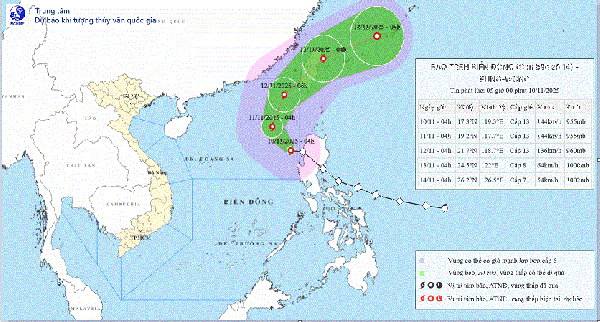 Hồi 4h ngày 10/11, vị trí tâm bão ở vào khoảng 17,3 độ Vĩ Bắc; 119,3 độ Kinh Đông, trên vùng biển phía Đông khu vực Bắc Biển Đông. Sức gió mạnh nhất vùng gần tâm bão mạnh cấp 13 (134-149km/giờ), giật cấp 16. Di chuyển theo hướng Tây Tây Bắc, tốc độ khoảng 25km/h.