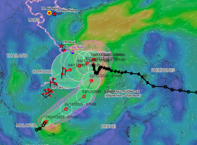 Trung tâm Dự báo khí tượng thủy văn quốc gia cho biết sáng 29/11, vị trí tâm bão số 15 (tên quốc tế là Koto) cách đảo Song Tử Tây khoảng 320 km về phía tây bắc, sức gió mạnh nhất cấp 9, cấp 10, giật cấp 13. Bão di chuyển theo hướng bắc, tốc độ khoảng 5 km/h. So với sáng qua, bão đã giảm 2 cấp, đường đi ngoặt lên phía bắc thay vì hướng tây nam.