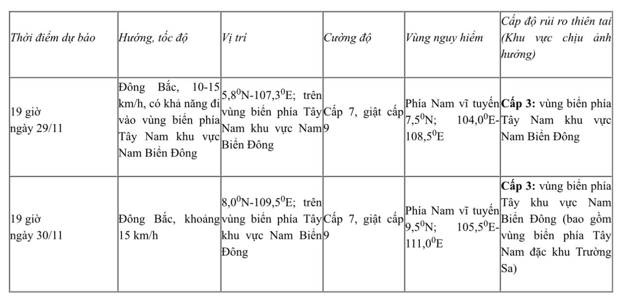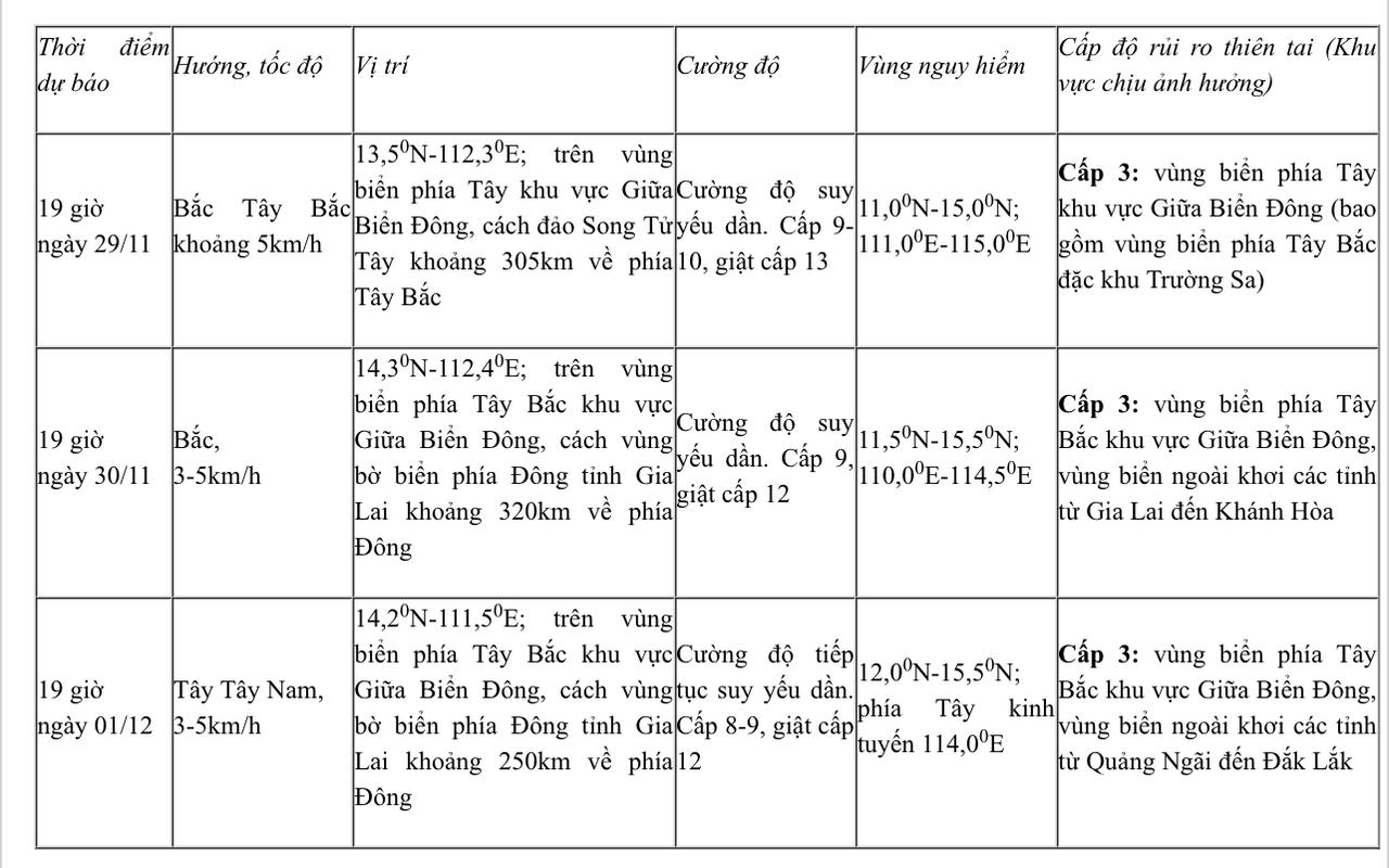19h ngày 28/11, vị trí tâm bão số 15 ở vào khoảng 12,5 độ Vĩ Bắc; 112,6 độ Kinh Đông, cách đảo Song Tử Tây khoảng 200km về phía Tây Bắc. Sức gió mạnh nhất vùng gần tâm bão mạnh cấp 10 (89-102km/h), giật cấp 13. Bão di chuyển theo hướng Tây Tây Bắc, tốc độ 3-5km/h.