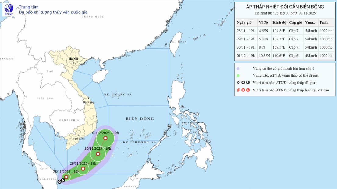 Về áp thấp nhiệt đới gần Biển Đông, 19h ngày 28/11, vị trí tâm áp thấp nhiệt đới ở vào khoảng 4,6 độ Vĩ Bắc; 104,8 độ Kinh Đông, trên vùng biển phía Đông Malaysia. Sức gió mạnh nhất vùng gần tâm áp thấp nhiệt đới mạnh cấp 6-7 (39-61km/giờ), giật cấp 9. Di chuyển theo hướng Đông Bắc với tốc độ khoảng 15km/h.