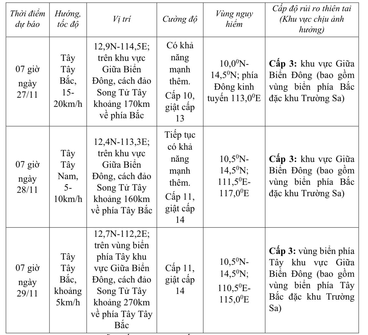 Trong khoảng ngày 27 - 28/11, khu vực giữa Biển Đông (bao gồm vùng biển phía Bắc đặc khu Trường Sa) có khả năng chịu tác động của gió mạnh cấp 11, giật cấp 14, sóng biển cao 7,0 - 9,0m, biển động dữ dội.
