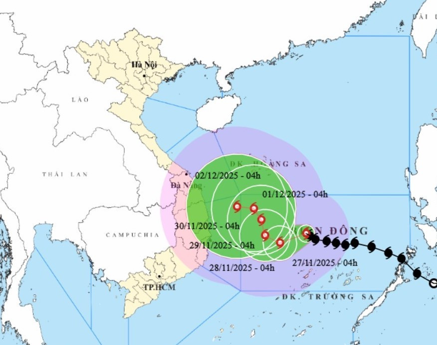 Đến 4h sáng 28/11, tâm bão cách đảo Song Tử Tây khoảng 190km về phía tây bắc với sức gió mạnh nhất cấp 12, giật cấp 15. Dự báo đây cũng là khoảng thời gian bão mạnh nhất.
