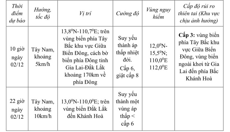 Trong ngày và đêm 1/12, vùng biển phía tây của giữa Biển Đông, vùng biển phía tây nam khu vực bắc Biển Đông (bao gồm đặc khu Hoàng Sa), và vùng biển từ Gia Lai đến Khánh Hòa có mưa rào và dông rải rác; riêng phía tây bắc giữa Biển Đông có mưa bão. Trong mưa dông có khả năng xuất hiện lốc xoáy và gió giật mạnh.
