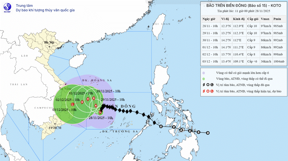 Theo dự báo của Trung tâm Dự báo khí tượng thủy văn Quốc gia, hồi 10h ngày 28/11, vị trí tâm bão ở vào khoảng 12,3 độ Vĩ Bắc; 112,9 độ Kinh Đông, cách đảo Song Tử Tây khoảng 180 km về phía Tây Bắc. Sức gió mạnh nhất vùng gần tâm bão mạnh cấp 10 (89-102 km/h), giật cấp 13. Di chuyển theo hướng Tây Nam, tốc độ 5 km/h.