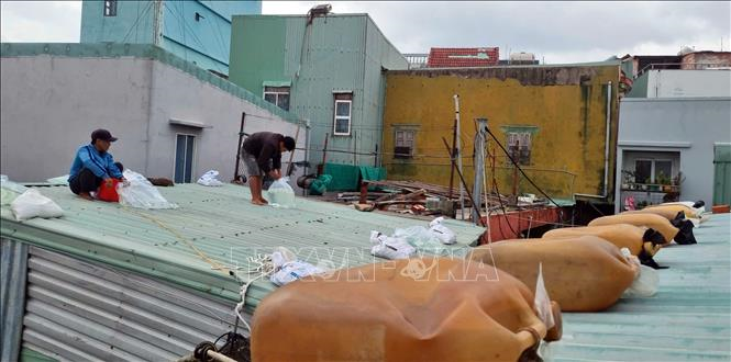 Người dân chủ động chèn, chắn mái nhà để ứng phó bão số 15.