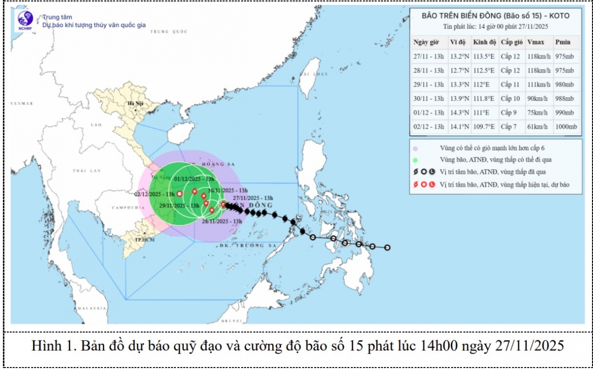Theo Trung tâm Dự báo Khí tượng Thủy văn Quốc gia, vào hồi 13 giờ ngày 27/11, tâm bão ở khoảng 13,2 độ Vĩ Bắc; 113,5 độ Kinh Đông, cách đảo Song Tử Tây khoảng 230 km về phía Bắc Tây Bắc. Sức gió mạnh nhất gần tâm bão đạt cấp 12 (118-133 km/h), giật cấp 15. Bão di chuyển theo hướng Tây Tây Bắc với tốc độ khoảng 10 km/h.