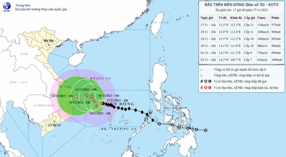Theo Trung tâm Dự báo khí tượng thủy văn quốc gia, hồi 16 giờ ngày 27-11, tâm bão ở khoảng 13,2 độ vĩ Bắc; 113,3 độ kinh Đông, cách đảo Song Tử Tây khoảng 230 km về phía Bắc Tây Bắc. Sức gió mạnh nhất vùng gần tâm bão đạt cấp 12, giật cấp 15. Bão di chuyển theo hướng Tây với tốc độ 5-10 km/h.