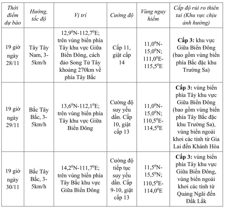 Từ gần sáng và ngày 28/11, vùng biển ngoài khơi từ Gia Lai đến Khánh Hòa có gió mạnh cấp 6-7, sau tăng lên cấp 8, giật cấp 9-10, sóng biển cao 5-7m, biển động mạnh.