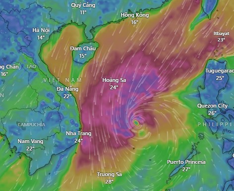 Bão số 15 (Koto) hiện cách đảo Song Tử Tây 180km, giật cấp 15. Ảnh: windy.com