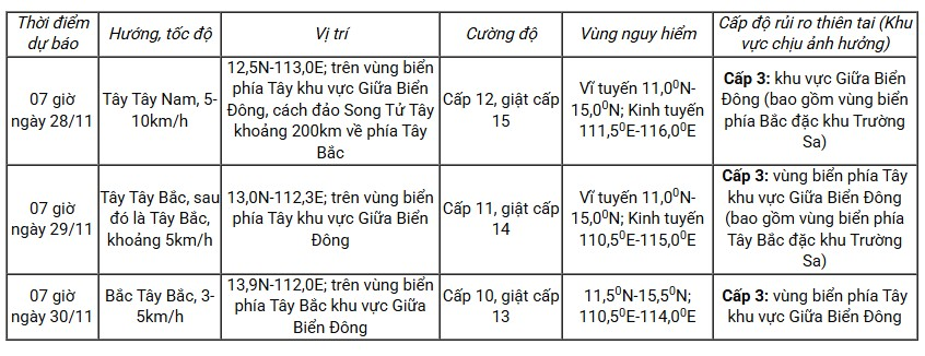 Do tác động của bão, khu vực Giữa Biển Đông (bao gồm vùng biển phía Bắc đặc khu Trường Sa) có gió mạnh cấp 7-9; vùng gần tâm bão đi qua mạnh cấp 10-12, giật cấp 15; sóng biển cao 4-6m, vùng gần tâm bão cao 7-9m; biển động dữ dội. Tàu thuyền hoạt động trong các vùng nguy hiểm nói trên đều có khả năng chịu tác động của dông, lốc, gió mạnh, sóng lớn.