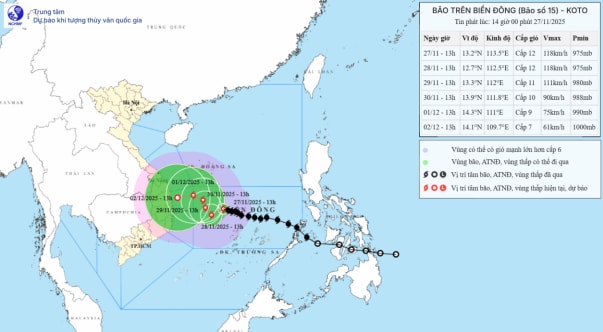 Bản đồ dự báo quỹ đạo và cường độ bão số 15 phát lúc 14h00 ngày 27/11