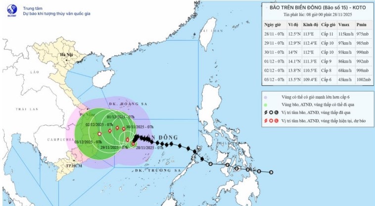 Bản đồ dự báo quỹ đạo và cường độ bão số 15 phát lúc 08h00 ngày 28/11